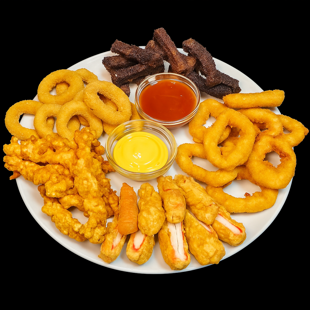 Луковые кольца в кляре (8шт), Кольца кальмара в кляре (8шт), Крабовые палочки в кляре, Гренки чесночные, Чикенсы.