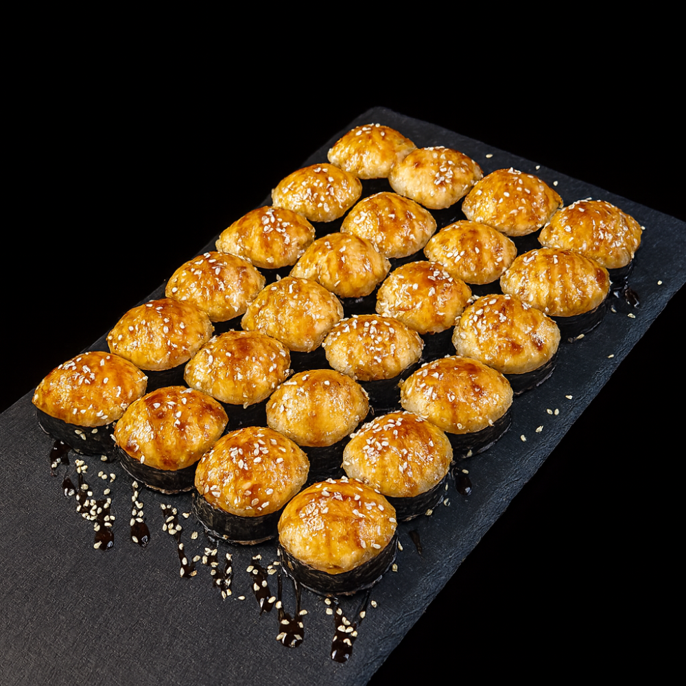Рис, нори, жареный лосось, копченая курица, крем-краб, мидии, помидор, соус Фудзи, Унаги соус.